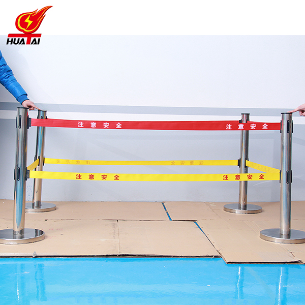 帶子長度3——5米,帶寬5cm。下面是鑄鐵的鐵墩外面帶一層不銹鋼罩,可以雙層也可以單層,一般是上紅下黃,可以根據客戶要求任意logo定做。每根立柱上都含有帶子,四個方向都可以掛帶子。